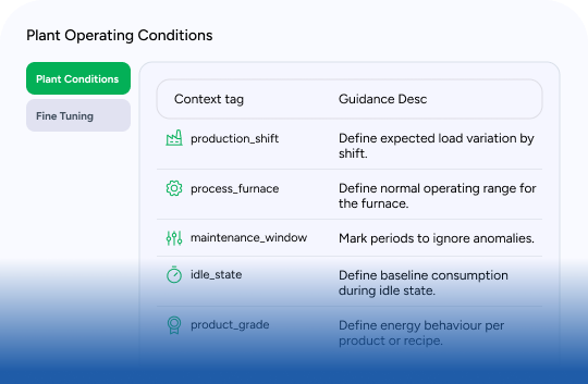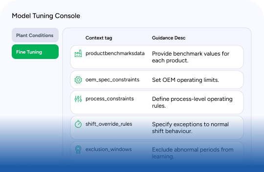 The platform uses pre-trained industrial models and continuously fine-tunes them using your operational, commercial, asset, and production context. It learns your load behaviour, constraints, performance baselines, and business priorities to ensure every recommendation reflects real-world plant conditions not generic assumptions.
