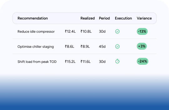 Each recommendation is issued with contextual instructions and assigned through a closed-loop workflow. The platform tracks execution and validates savings by comparing baseline performance with post-action results.