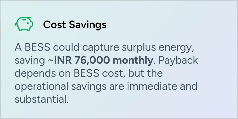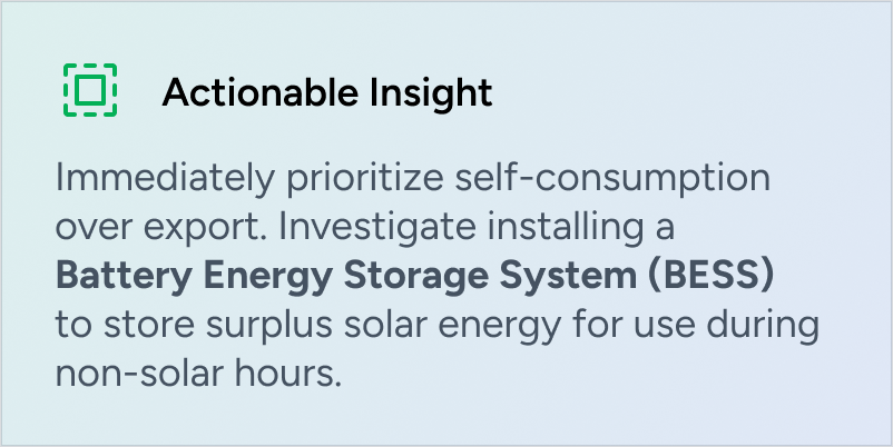 - The Al model continuously learns real source availability, dispatch constraints, and demand behavior from interval-level data. Across 11 of the last 12 billing cycles, the same under-utilization pattern was observed during peak hours, confirming a repeatable and controllable energy sourcing gap rather than a one-time operational event.